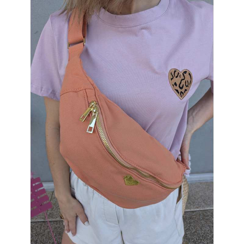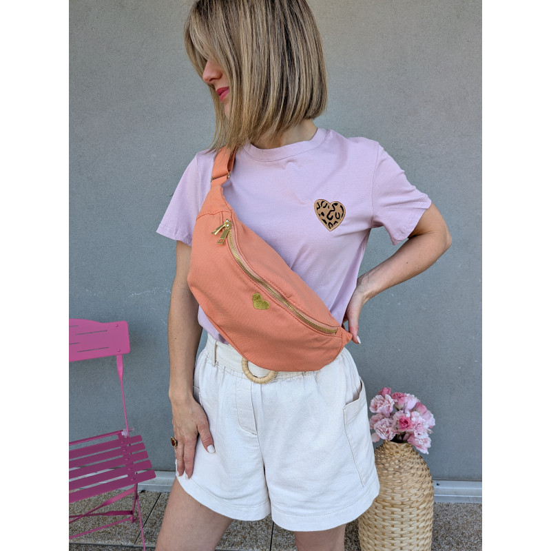 Banane en tissu, couleur Orange/Terracotta avec un petit motif cœur doré.
