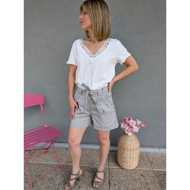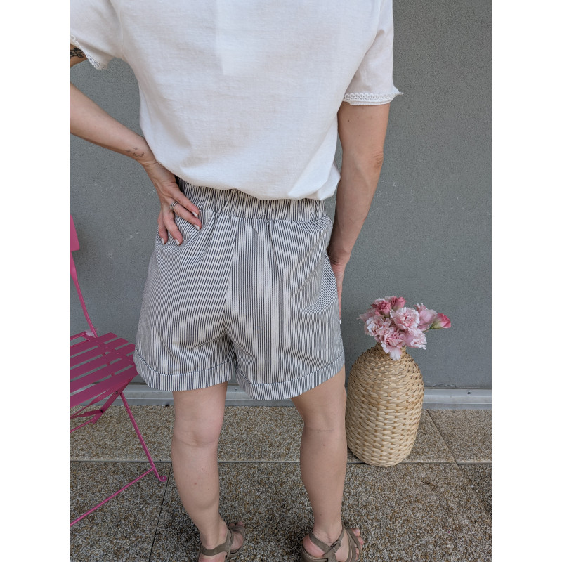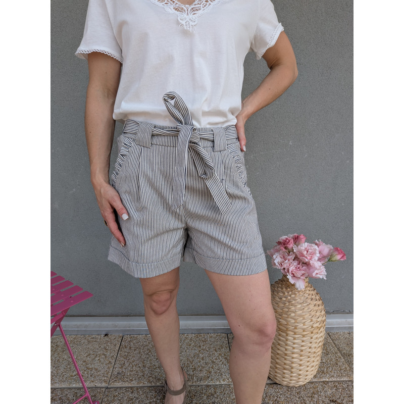 Short en coton rayure bleu marine, élastique à la taille avec ceinture en tissu.