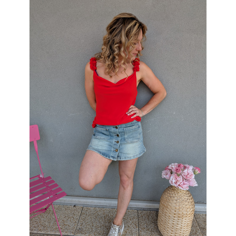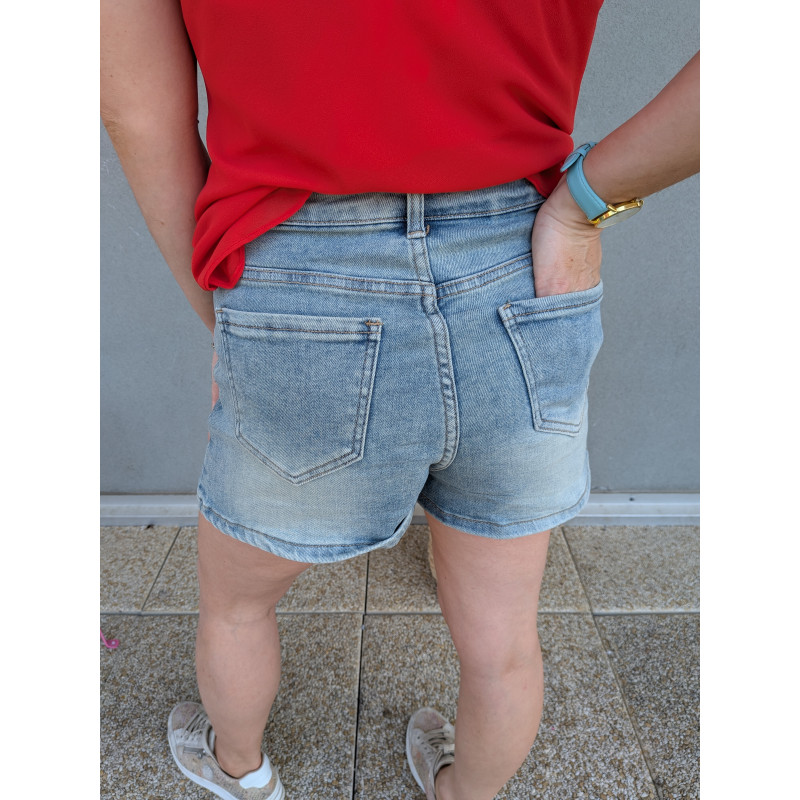Jupe short en jean clair, détail boutons devant.