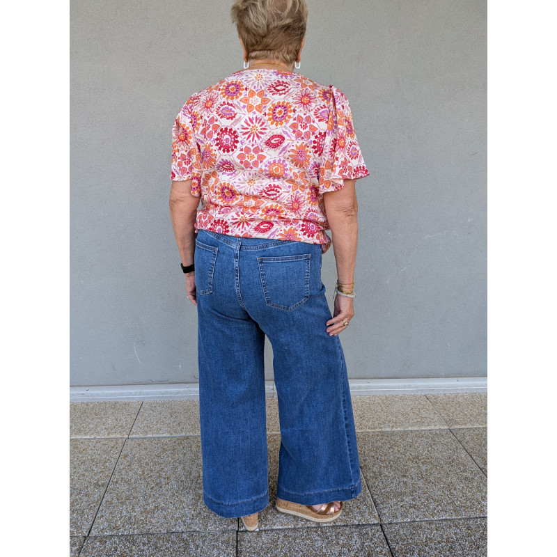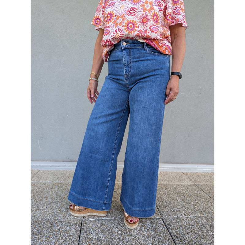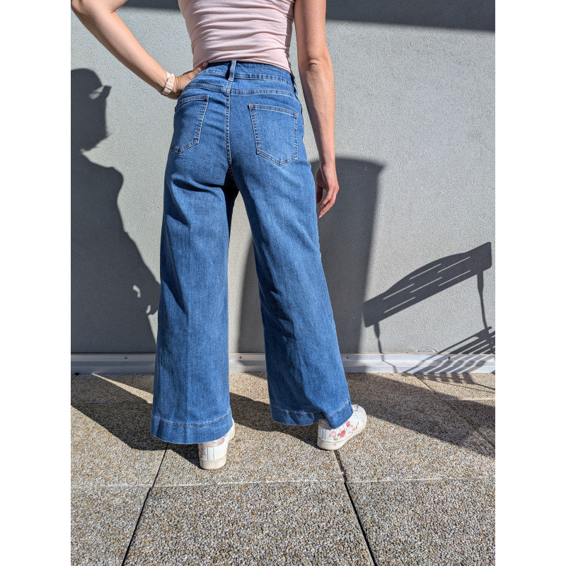 Son denim bleu intemporel se marie aussi bien avec des baskets pour un look casual que avec des talons pour une allure plus chic.
