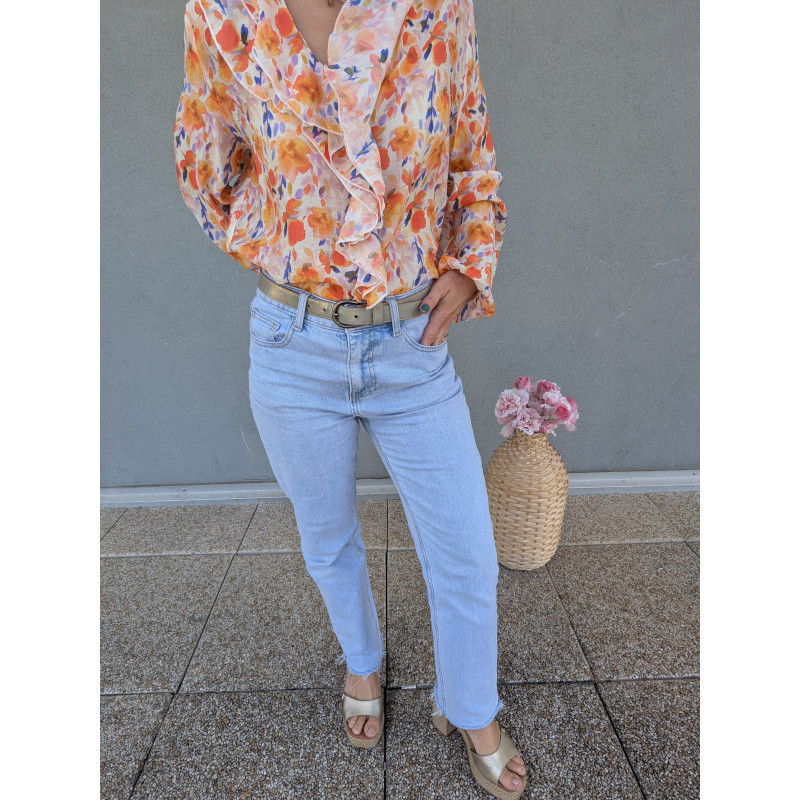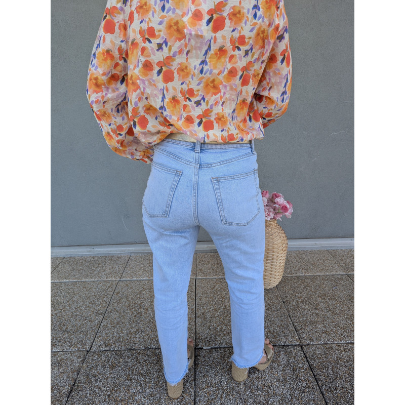 Jean denim bleu clair, pièce indispensable pour un look à la fois moderne et décontracté. Sa coupe droite flatte toutes les morphologies et offre un confort optimal au quotidien.