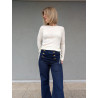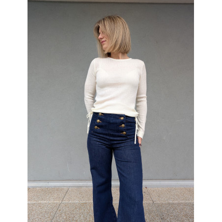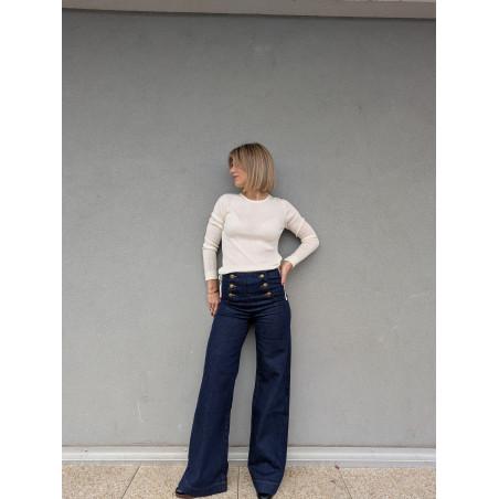 Adoptez le charme intemporel du style marin avec ce jean taille haute à boutons dorés. Sa coupe flatteuse met en valeur la silhouette tout en offrant un confort absolu grâce à une toile de denim souple et de qualité.