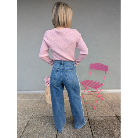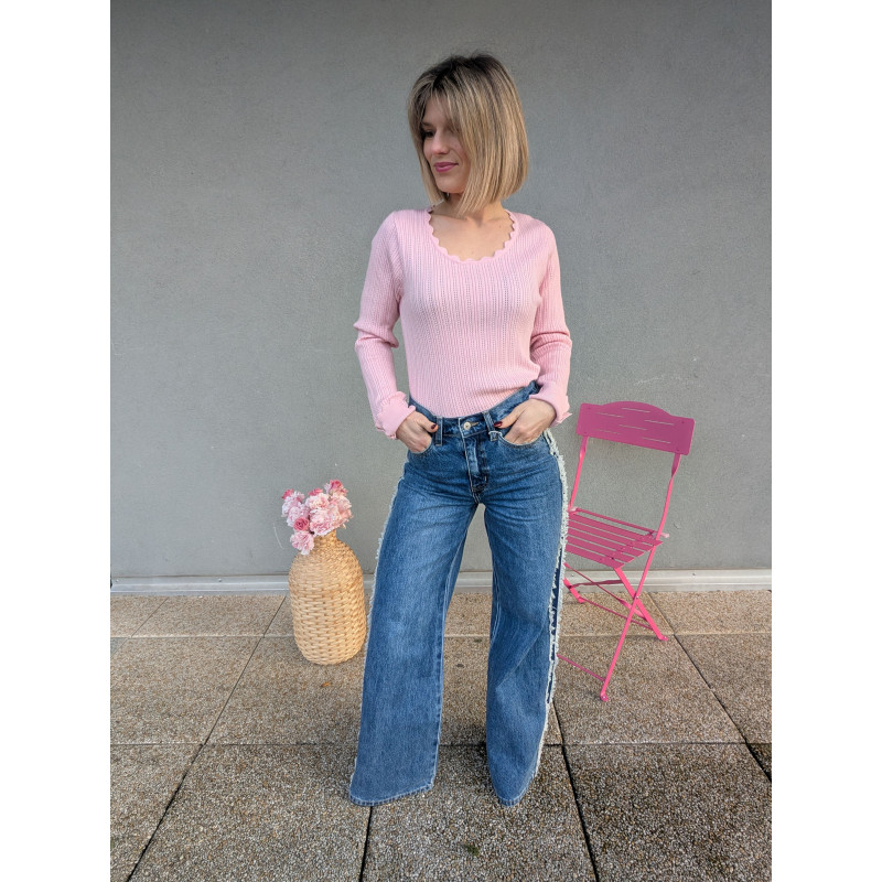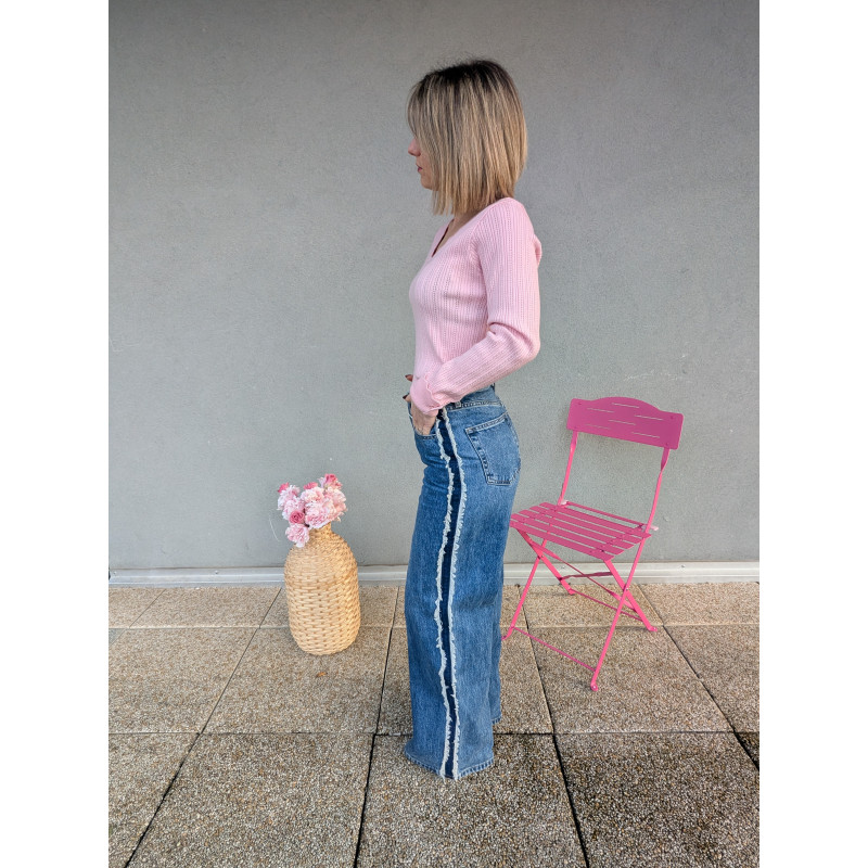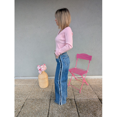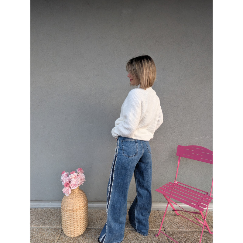 Ce jean large et évasé est la pièce parfaite pour sublimer la silhouette avec style. Sa bande ornée de petites franges sur le côté apporte une touche originale et ultra moderne, tout en allongeant visuellement la jambe pour une allure élancée et élégante.