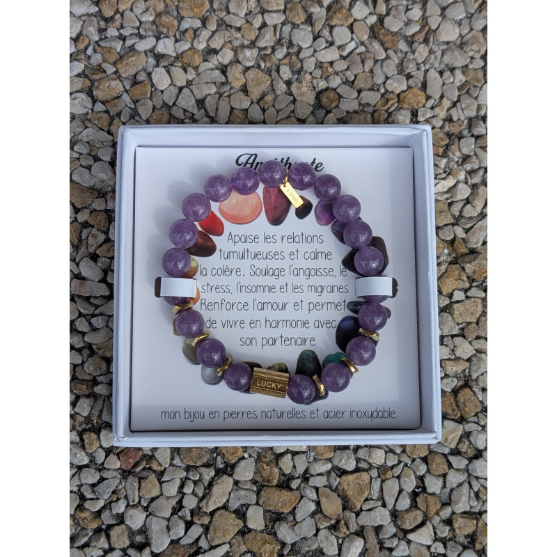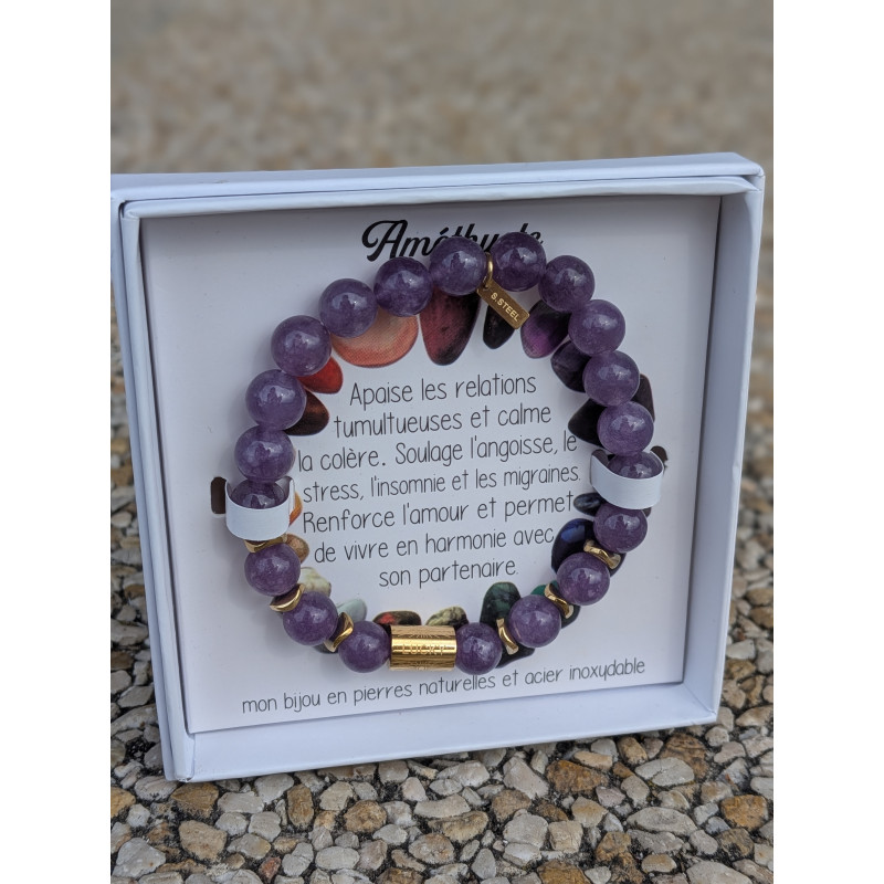 Améthyste (bracelet violet): apaise les relations tumultueuses et calme la colère. Soulage l'angoisse, le stress, l'insomnie et les migraines. Renforce l'amour et permet de vivre en harmonie avec son partenaire.