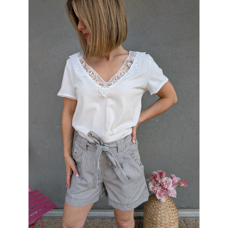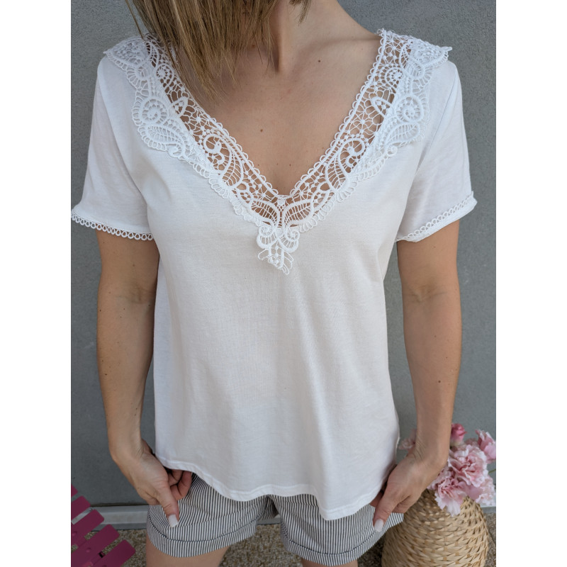 Craquez pour ce joli top blanc coton, sublimé par un décolleté en V orné de dentelle en broderie.