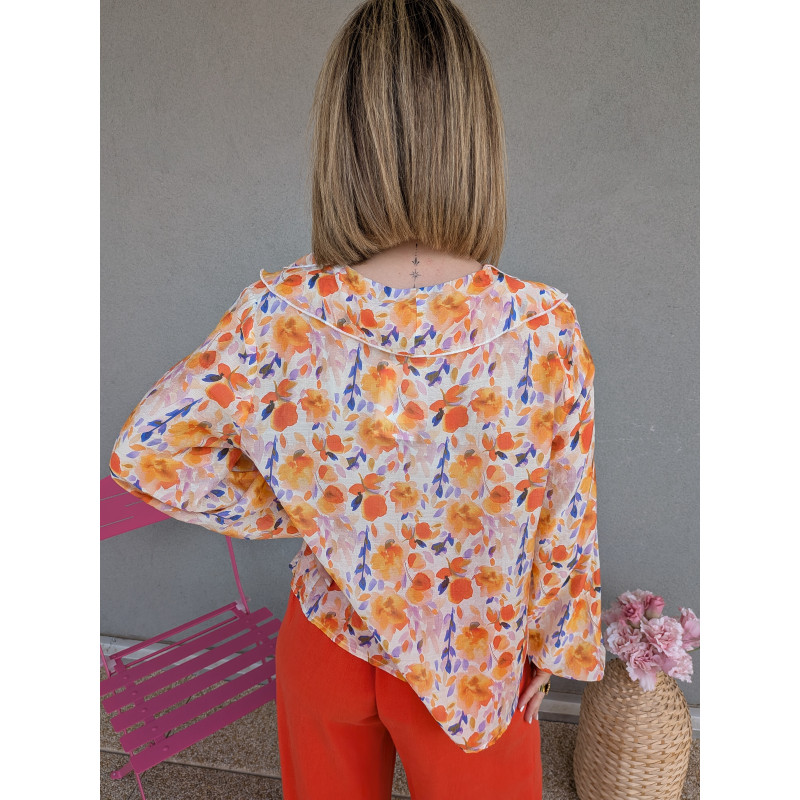 Blouse élégante et colorée avec des motif fleuris.