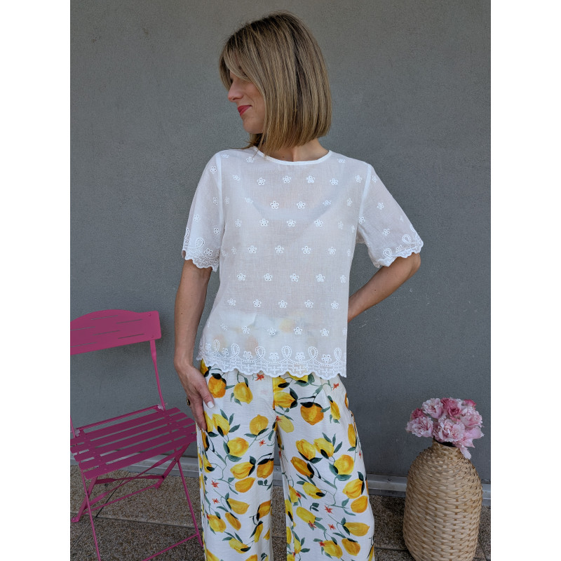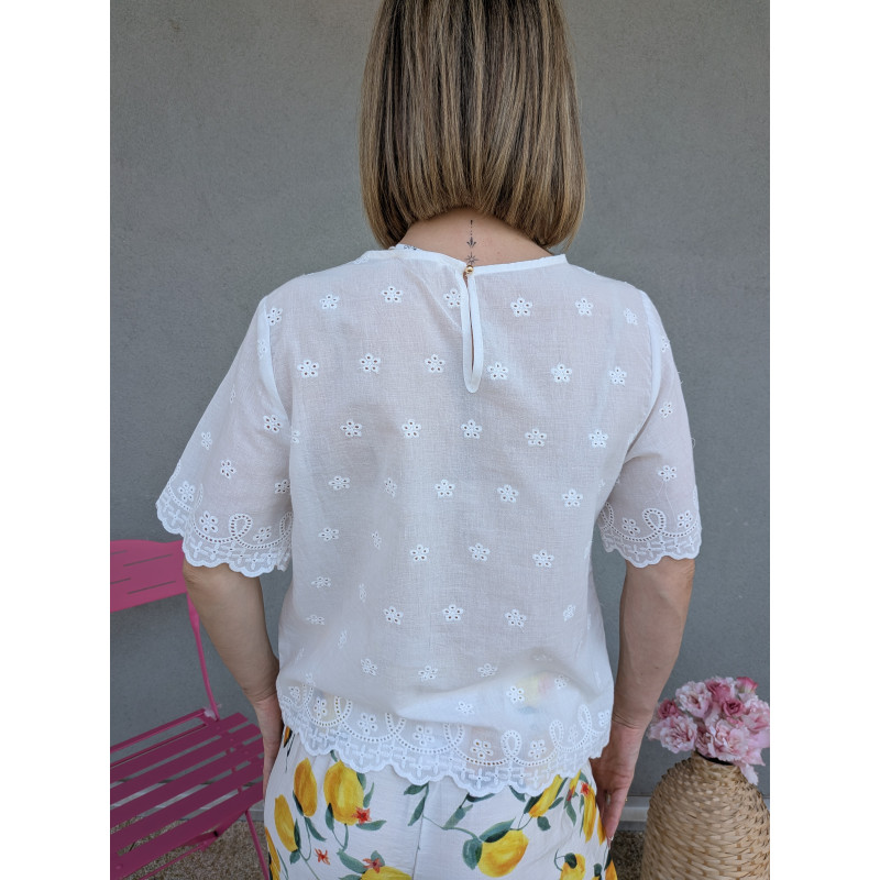 Blouse en coton avec des petites fleurs en broderie! Jolie finition sur les manches et le bas de la blouse.