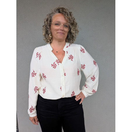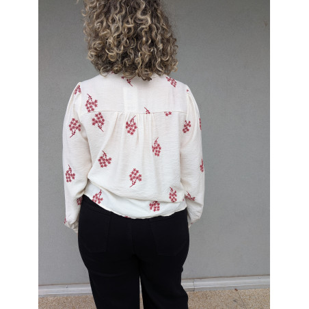 Laissez-vous séduire par le charme intemporel de cette chemise fluide en tissu crème, délicatement rehaussée de motifs floraux rouges. son style raffiné et féminin en fait une pièces polyvalente, idéale aussi bien pour le bureau que pour une sortie décontractée.