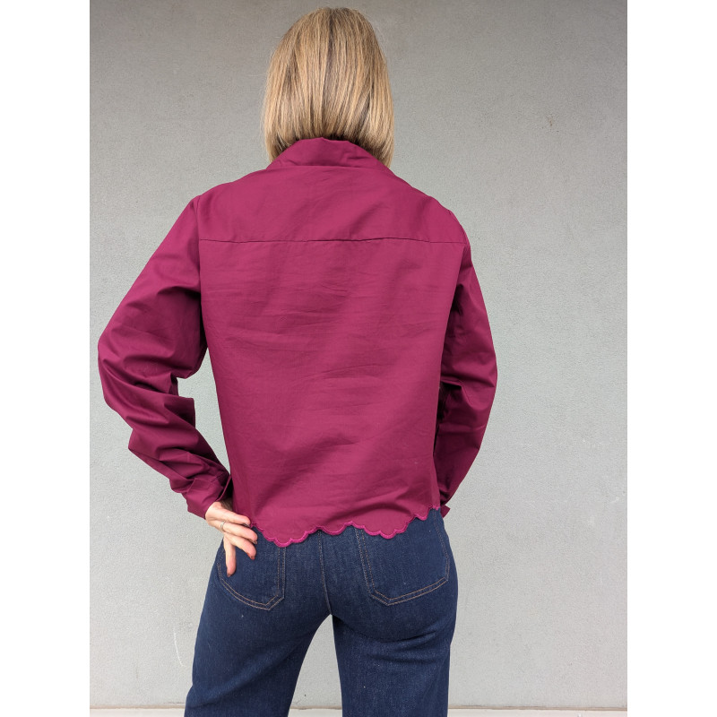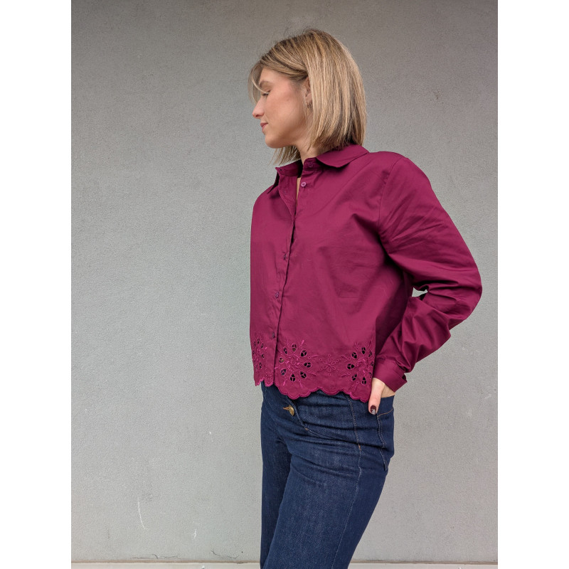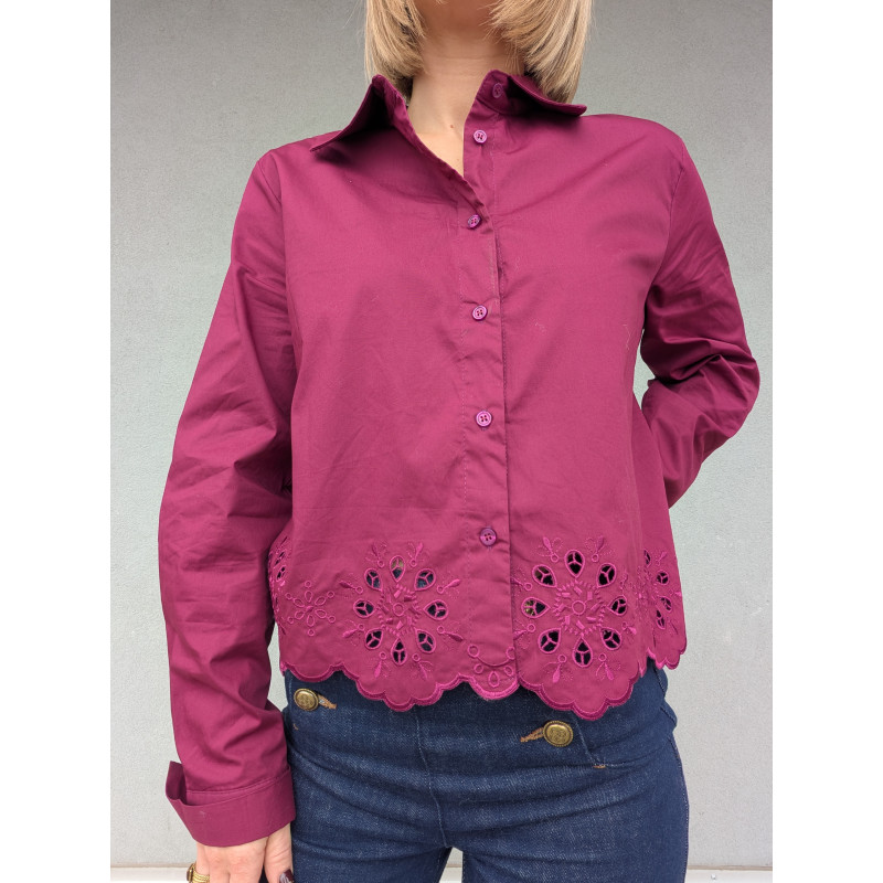Craquez pour cette chemise bordeaux au charme délicat, parfaite pour allier élégance et originalité. Sa base brodée de motifs ajourés floraux apporte une touche romantique et raffinée, tandis que sa coupe droite assure un tombé fluide et flatteur.
