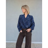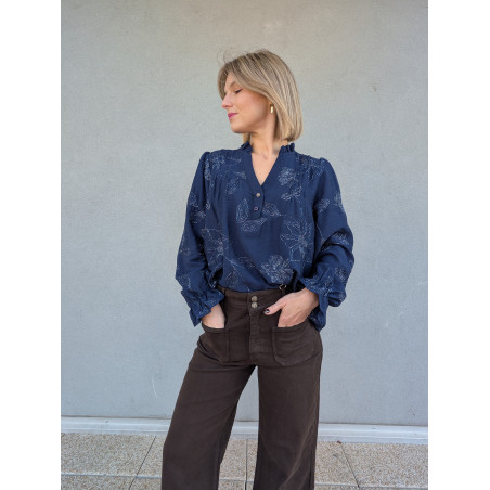 Avec son col légèrement volanté et sa patte de boutonnage discrète, cette blouse se porte aussi bien rentrée dans un jean pour une allure décontractée que sur un pantalon habillé pour un style plus chic.