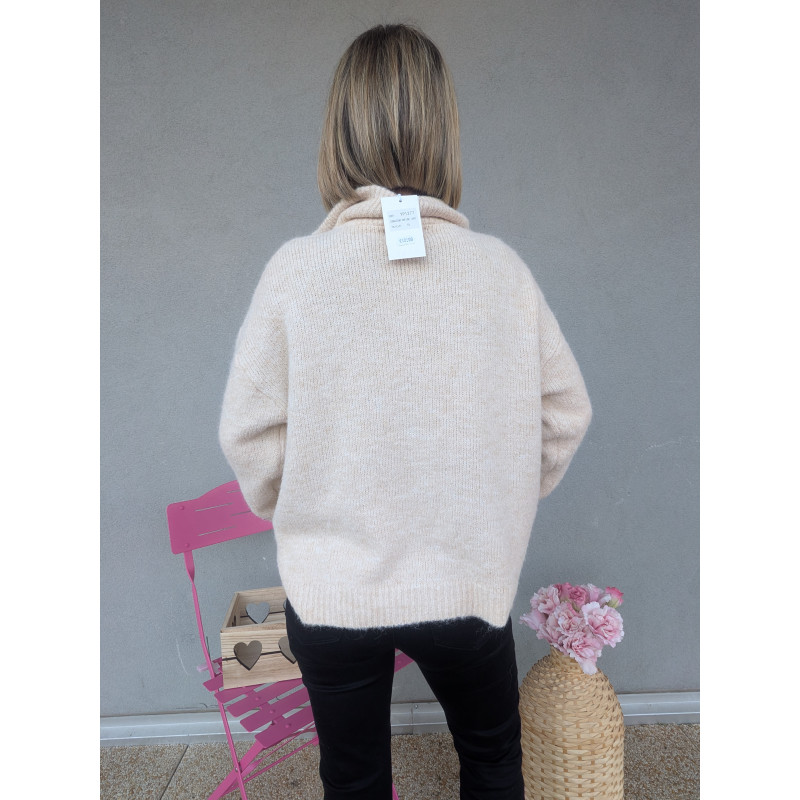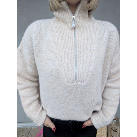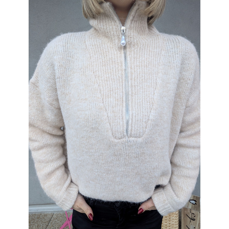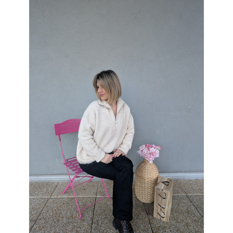 Son col montant avec fermeture zippée apporte une touche moderne et pratique, permettant de le porter ouvert ou fermé selon le style souhaité. Les finissions soignées et la maille délicate en font un vêtement idéal pour la mi-saison comme pour l’hiver.