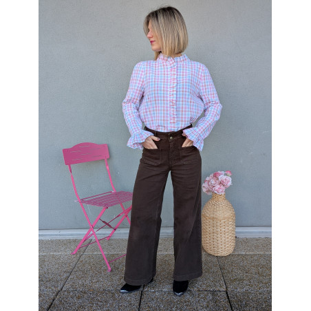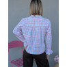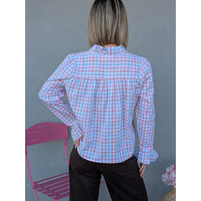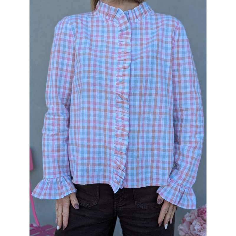 Son motif à carreaux aux tons pastel apporte une touche fraîche et lumineuse, tandis que le volant central et le col montant donnent immédiatement du style à la silhouette. Les manches longues se terminent par de jolis poignets volantés pour une allure féminine et élégante.