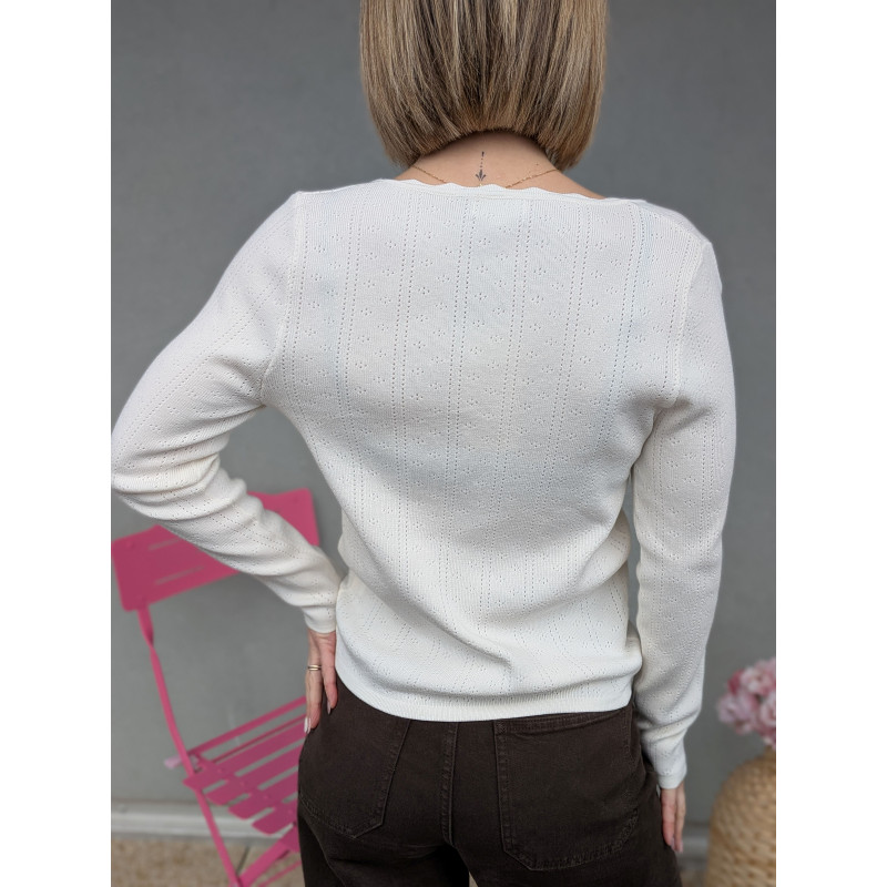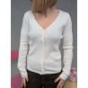 Confectionné dans une matière légère et agréable à porter, il se distingue par son col en V délicatement festonné et sa boutonnière assortie, qui lui donne un charme féminin et raffiné.