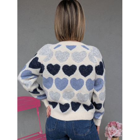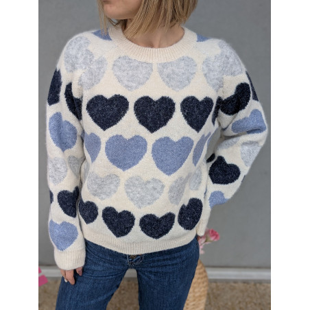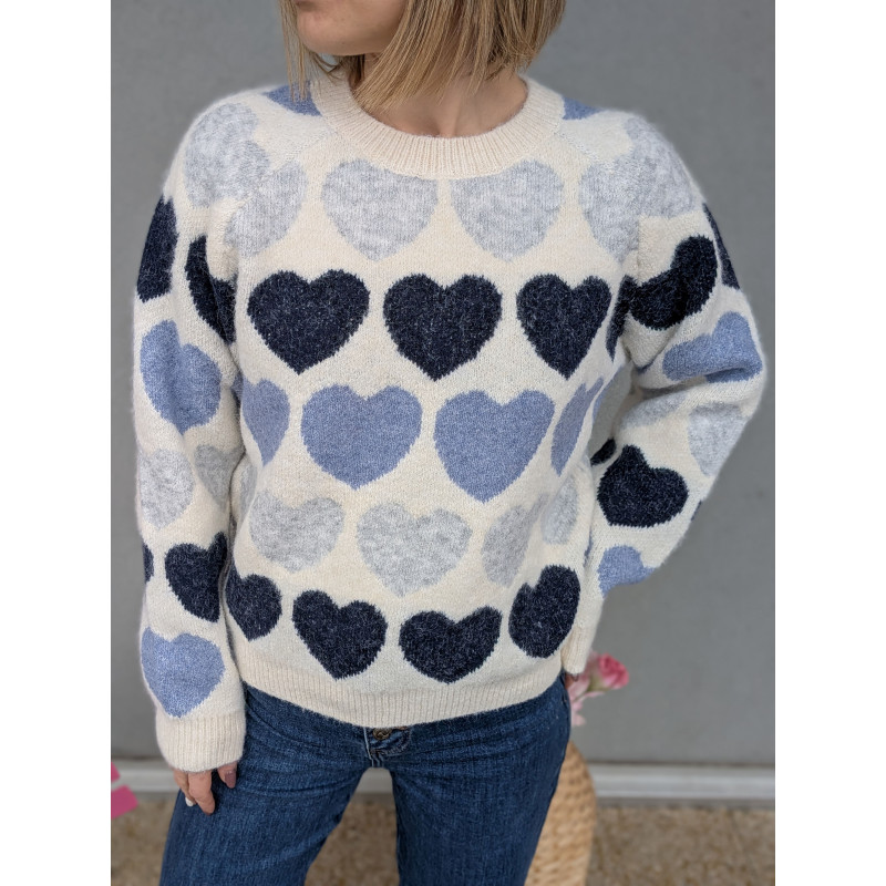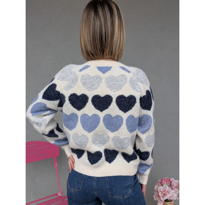 Craquez pour ce pull ultra-charmant qui apporte instantanément une touche de douceur et de romantisme à votre tenue. Son imprimé cœurs délicatement contrastés dans des tons bleu, gris et écru illumine le look tout en restant élégant et facile à porter au quotidien.