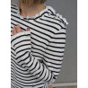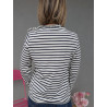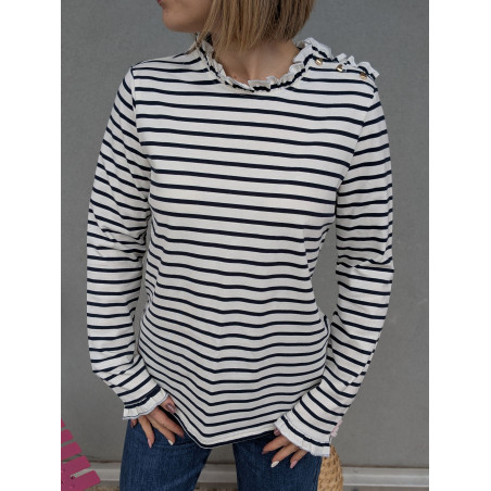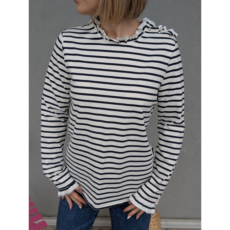 Craquez pour cette marinière revisité, un indispensable du dressing féminin mêlant élégance et douceur. Ses fines rayures intemporelles sont sublimées par un col volanté délicat, qui apporte une touche romantique et raffinée.