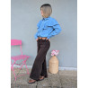 Cette chemise en jean revisite un grand classique avec une touche féminine et moderne. Confectionnée dans un denim doux et confortable, elle se distingue par ses volants élégants en V sur le devant, qui apportent du caractère et une belle structure à la silhouette.