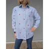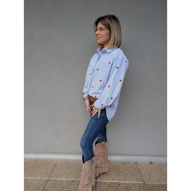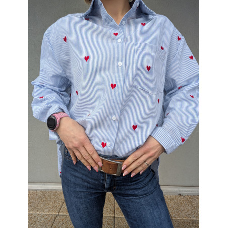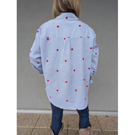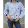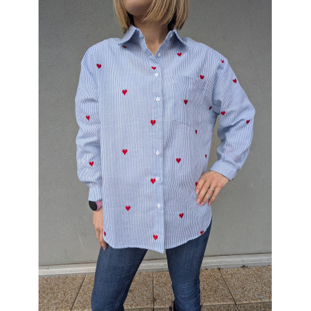 Apportez une touche de fraîcheur et d’originalité à votre dressing avec cette chemise rayée bleu clair ornée de délicats cœurs rouges brodés. Sa coupe confortable et légèrement ample en fait une pièce facile à porter au quotidien, aussi bien avec un jean casual qu’un pantalon plus habillé.