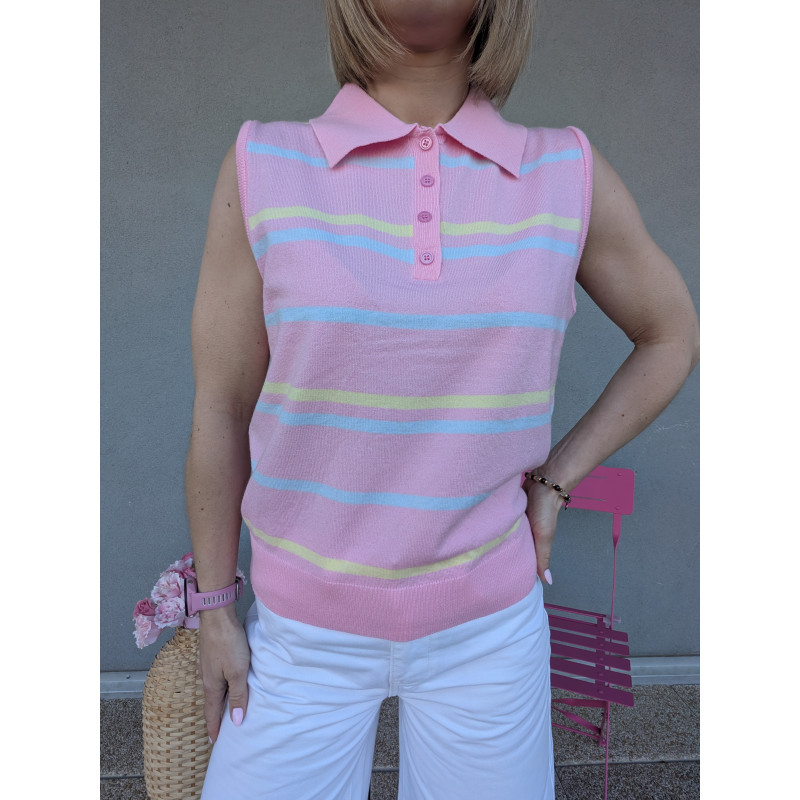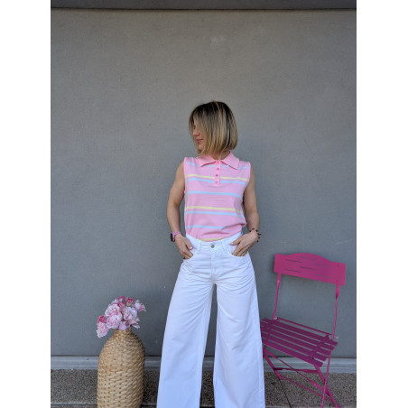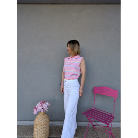 Craquez pour ce top sans manches au charme irrésistible, parfait pour illuminer vos tenues du quotidien. Sa maille douce et confortable épouse délicatement la silhouette, tandis que son col polo apporte une touche chic et intemporelle.