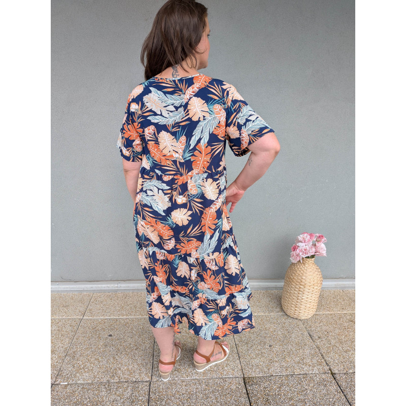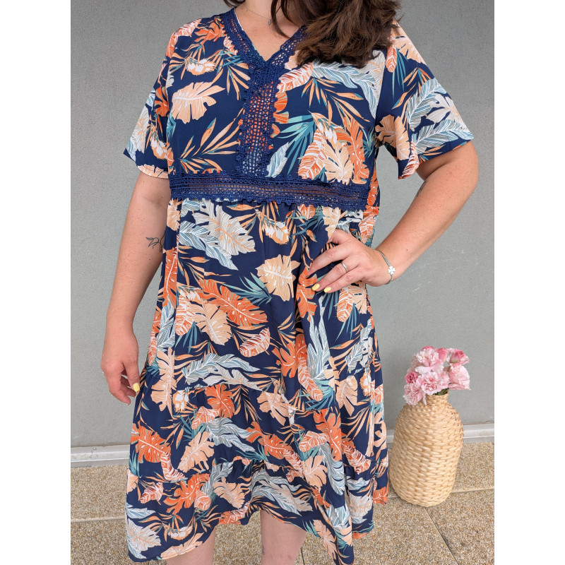 Robe fantaisie multicolore, ajourée avec de la broderie bleue en dessous de la poitrine pour plus d'originalité.