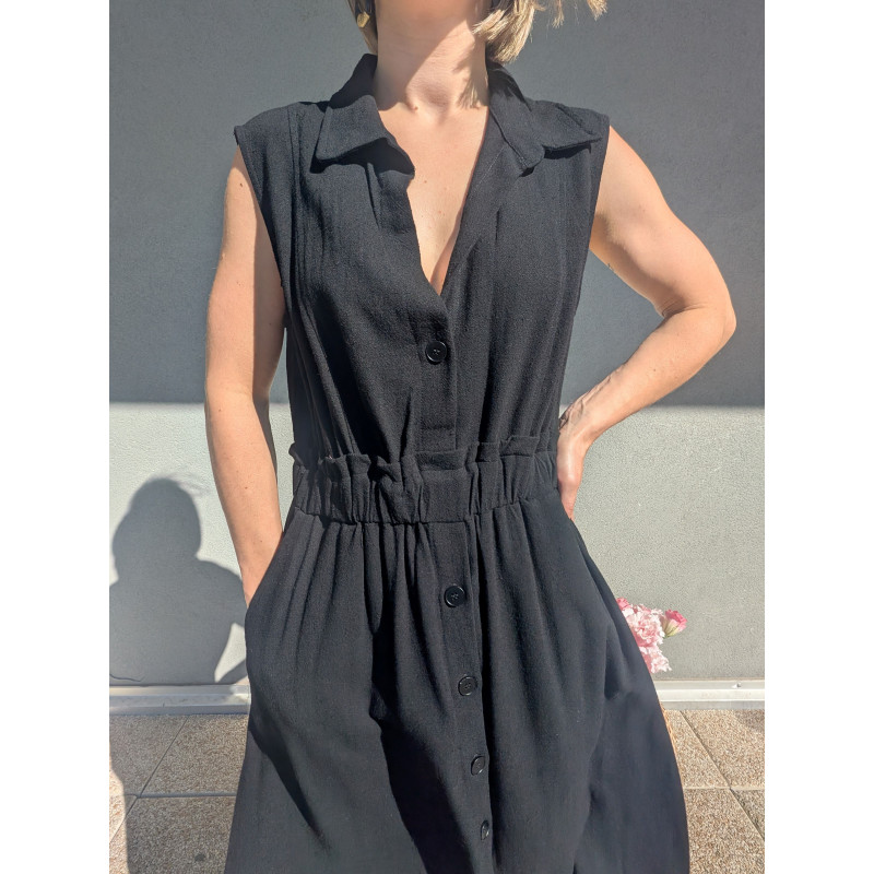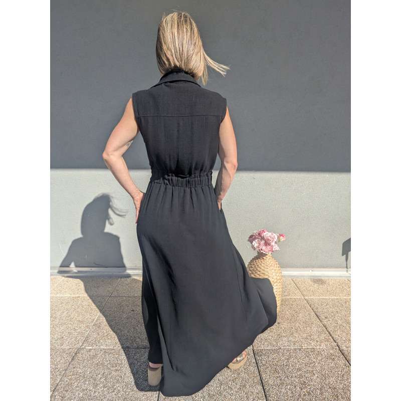 Elégante et fluide, cette robe longue noire sans manches met en valeur la silhouette grâce à sa taille cintrée élastiquée et sa patte de boutonnage. Un indispensable chic et confortable.