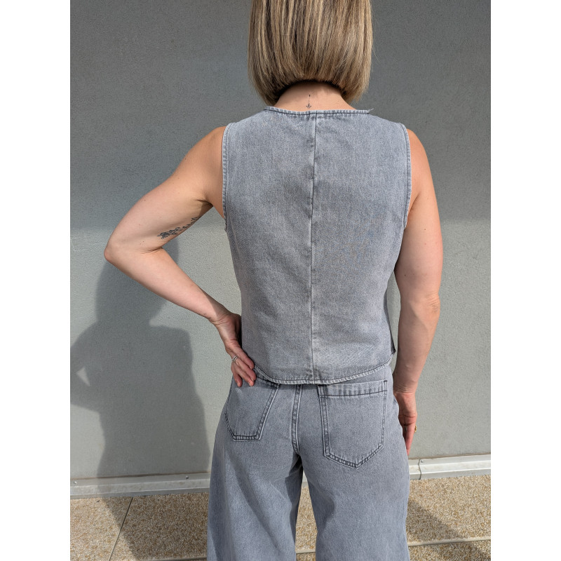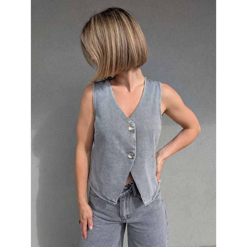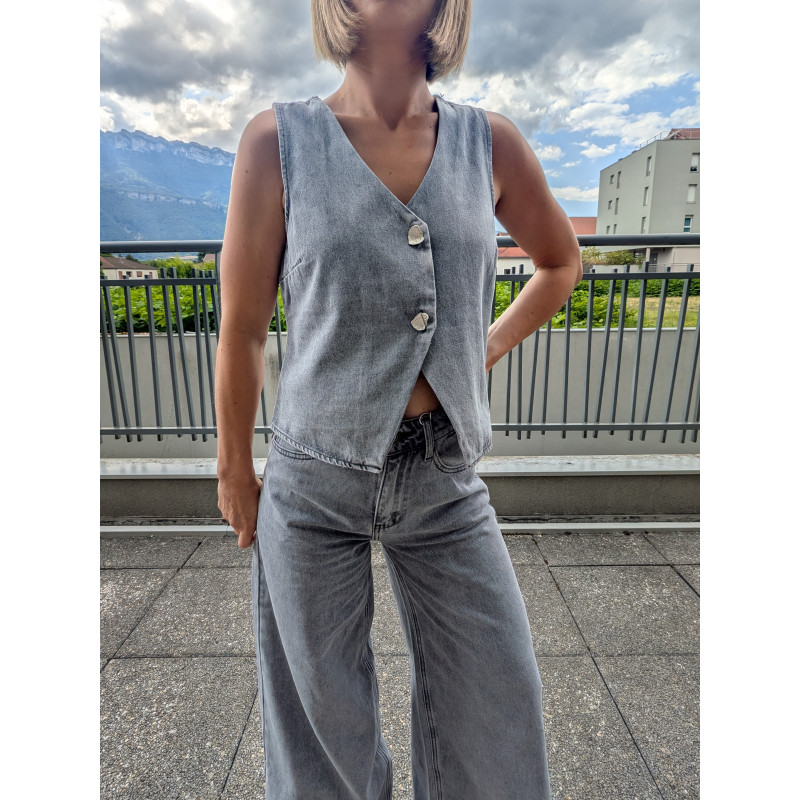 Gilet sans manches original et tendance à porter de multiples façon, également en total look avec le jean assorti.