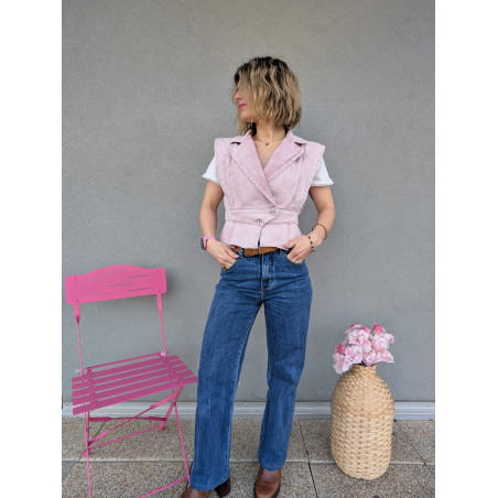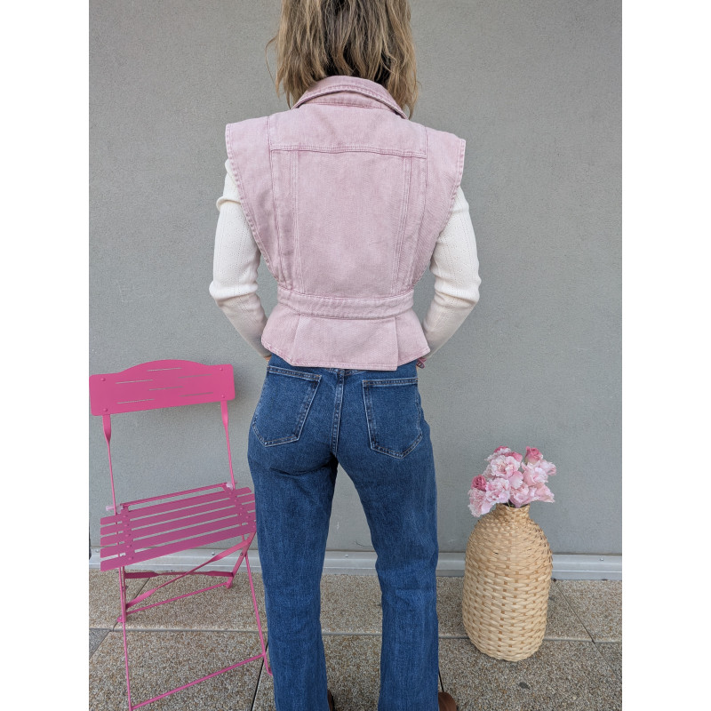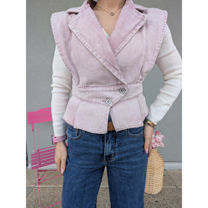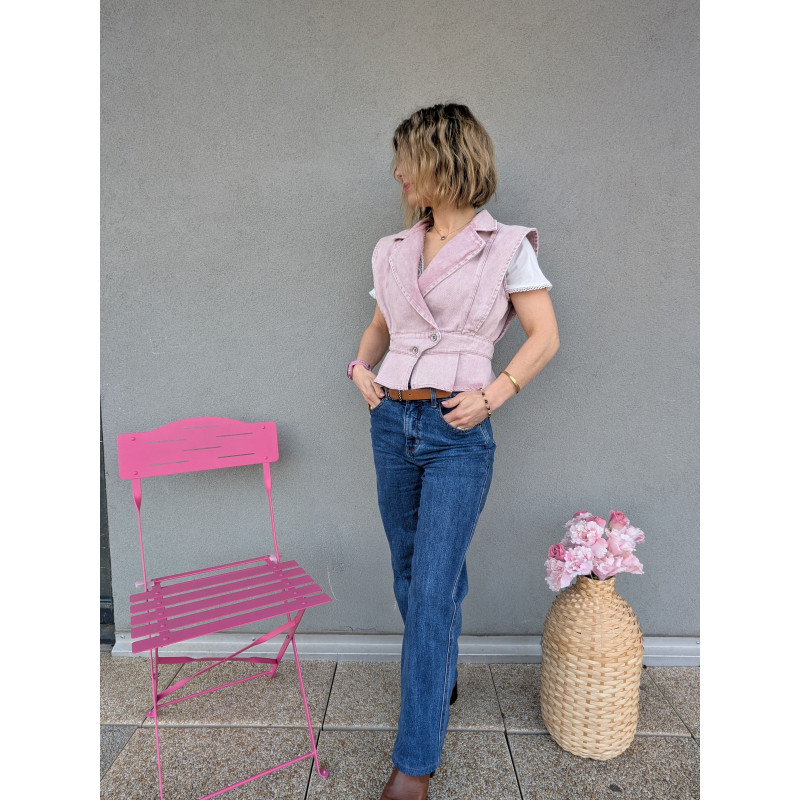 Apportez une touche de douceur et de style à votre tenue avec cette petite veste en jean rose. Son design structuré avec large col tailleur et fermeture asymétrique lui donne une allure moderne et féminine. Sa coupe légèrement cintrée met en valeur la silhouette tout en restant confortable à porter au quotidien.